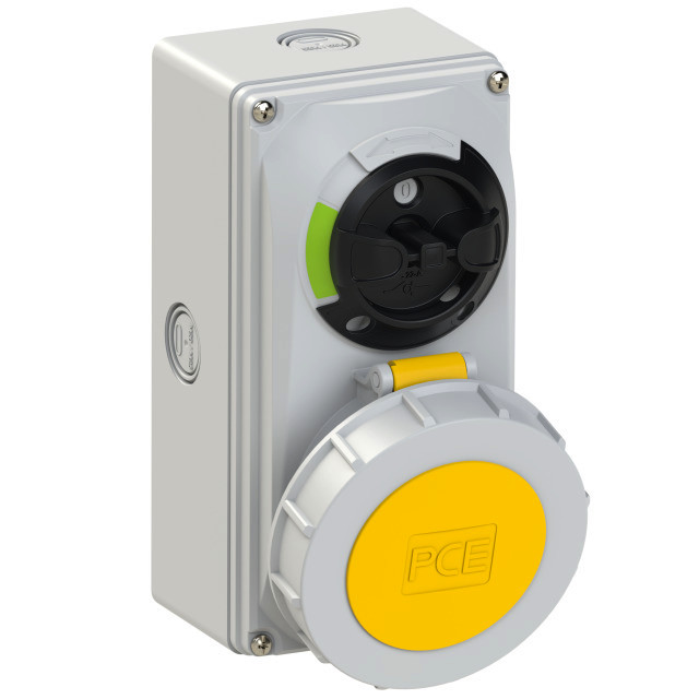 CEE-Steckdose abschaltbar kompakt 32A 5p 4h IP66/IP67 Knock Out; Gehäusematerial: PA6 + PC/ABS; Nennstrom: 32A; Polzahl: 5 (3P+N+PE); Uhrzeit-Stellung: 4h; Nennspannung/Frequenz: 57/100V~ - 75/130V~ / 50+60Hz; Kontakte: Messing vernickelt; Anschlusstechnik: Schraubklemmen; Wanddose mit Ausbrüchen, mechanisch verriegelt; Schalter: EIN/AUS PCE-Merz ML0; EN 60947-3; AC22A, 10kA; Schutzart: IP66/IP67