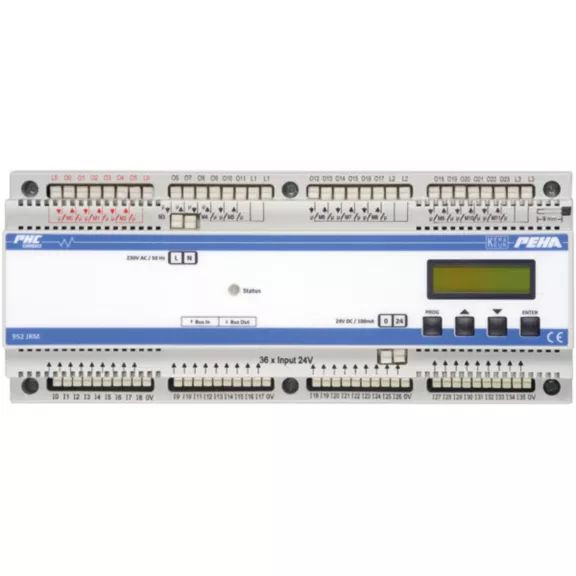Jalousie-/Rollladenmodul zum Aufrasten auf DIN-Tragschiene, 24 Ausgänge 230 V~ für 12 Rollladenmotore (max. 1 A), 24 Eingänge 24 V für 12 Doppeltaster AUF/AB, 2 Eingänge für Zentralsteuerung für Doppeltaster AUF/AB, 1 Eingang für Automatik EIN/AUS für ein