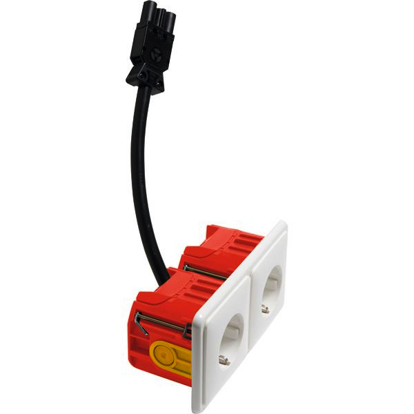 bestehend aus: (von links nach rechts) 2 -fach SCHUKO Steckdose mit Schraubklemmen, 2-polig, 10/16 A 250 V , im 2 -fach Rahmen, mit Anschlusskabel und Wieland gesis GST 18 Steckverbinder, Kabellänge 30 cm und Brandschutz Attema-Dose UHW Ausführung horizontal