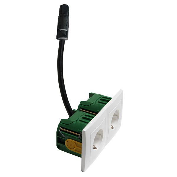 bestehend aus: (von links nach rechts) 2 -fach SCHUKO Steckdose mit Schraubklemmen, 2-polig, 10/16 A 250 V , im 2 -fach Rahmen, mit Anschlusskabel und WAGO WINSTA RD (rund) Steckverbinder, Kabellänge 30 cm und halogenfreier Attema-Dose UHW50, Ausführung horizontal