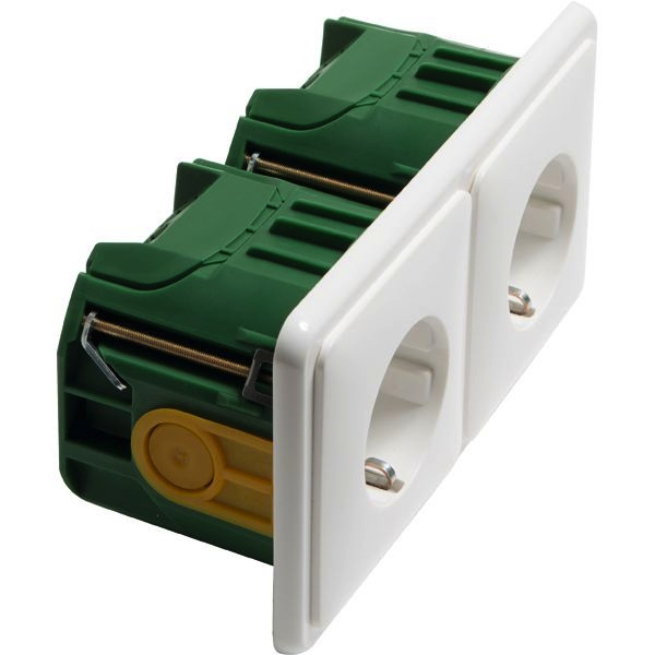 bestehend aus: (von links nach rechts) 2 -fach SCHUKO Steckdose mit Schraubklemmen, 2-polig, 10/16 A 250 V , im 2 -fach Rahmen, mit WAGO WINSTA MIDI Steckverbinder, und halogenfreier Attema-Dose UHW50, Ausführung horizontal