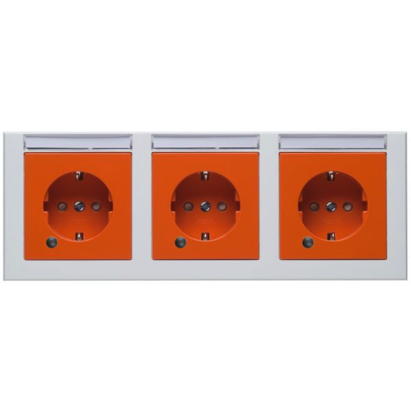 bestehend aus: (von links nach rechts) 3 -fach SCHUKO Steckdose mit Schraubklemmen, 2-polig, 10/16 A 250 V ?, mit oranger Abdeckung, 3 -fach Rahmen, mit Beschriftungsfeld, mit integriertem WAGO WINSTA MIDI Steckverbinder, und halogenfreier Attema-Dose UHW50, Ausführung horizontal