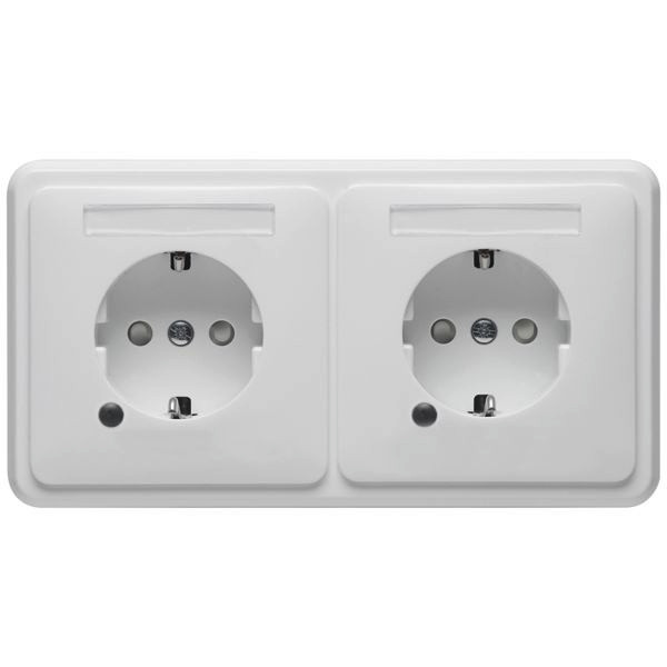 bestehend aus: (von links nach rechts) 2 -fach SCHUKO Steckdose mit Schraubklemmen, 2-polig, 10/16 A 250 V , mit erhöhtem Berührungsschutz, Funktionskontrollleuchte grün, mit Beschriftungsfeld, im 2 -fach Rahmen, mit Wieland gesis GST18 Steckverbinder, und halogenfreier Attema-Dose UHW50, Ausführung horizontal