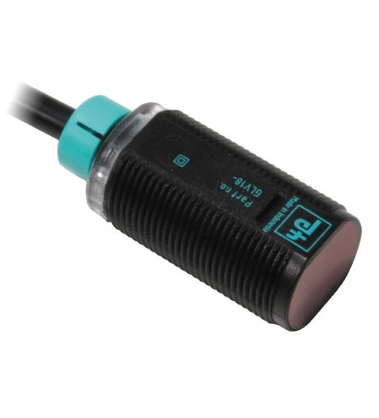 Reflexionslichtschranke, Gewindebauform M18, Kunststoffgehäuse, Lichtaustritt frontal, Reichweite 6,5 m, Rotlicht, Hellschaltung, DC-Version, NPN-Ausgang, Festkabel, Efficient-Line im kurzen M18-Kunststoffgehäuse für Standard-Anwendungen, Sehr hohe Reichweite, 4 Anzeige LEDs für 360° Sichtbarkeit, Optimiertes Poti-Design für gute Sichtbarkeit der Bedienelemente in der Applikation, Version mit Lichtaustritt frontal