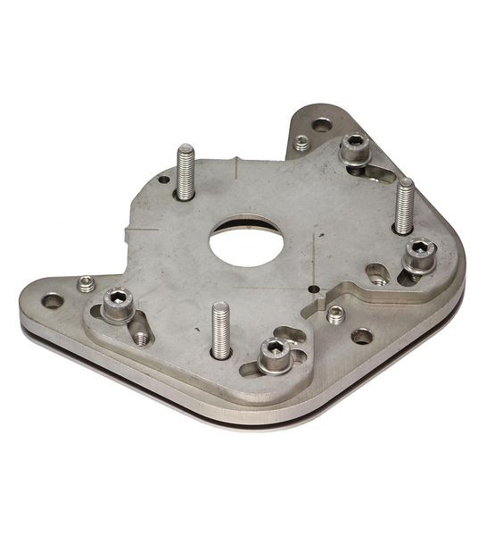 Drehen des Winkelspiegels SLCT-M-01 um die physikalisch bevorzugte Achse, Vertikaljustierung von Drehung entkoppelt, Montage auf Bodenanker, Bodenabführung von Leitungen über Bohrung für NW29 Verschraubung und Wellschlauch, Bodenplatte zum Ausgleich von Bodenunebenheiten, insbesondere bei sprödem Untergrund, Nur ca. 20 mm Höhe von Unterkante Bodenplatte zu Oberkante Grundplatte, Safety Serie: SLCT / SLCS