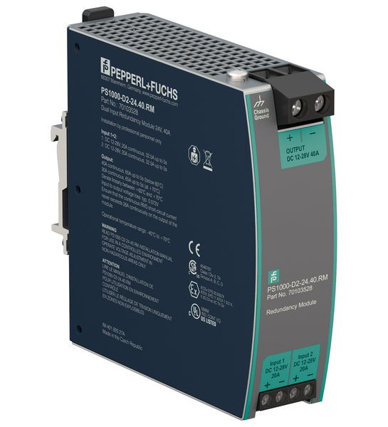 Eingang 12 V DC bis 28 V DC, 2 Eingänge mit 1 Ausgang, Ausgang 24 V DC, 40 A, Gehäusebreite 36 mm, Integrierte Entkopplungs-Mosfets für 1+1- und N+1-Redundanz, Nur 72 mV Spannungsabfall bei 20 A Ausgangsstrom, Nur 1,7 W Verlust bei 2 x 10 A und 5,9 W bei 2 x 20 A Eingangsstrom, Verpolschutz des Eingangs, Geeignet für die Montage in Zone 2/Div. 2, Gerätetyp: Gerät für Hutschienenmontage, Funktion: Redundanzmodul, Spannungsbereich: 12 ... 28 V DC