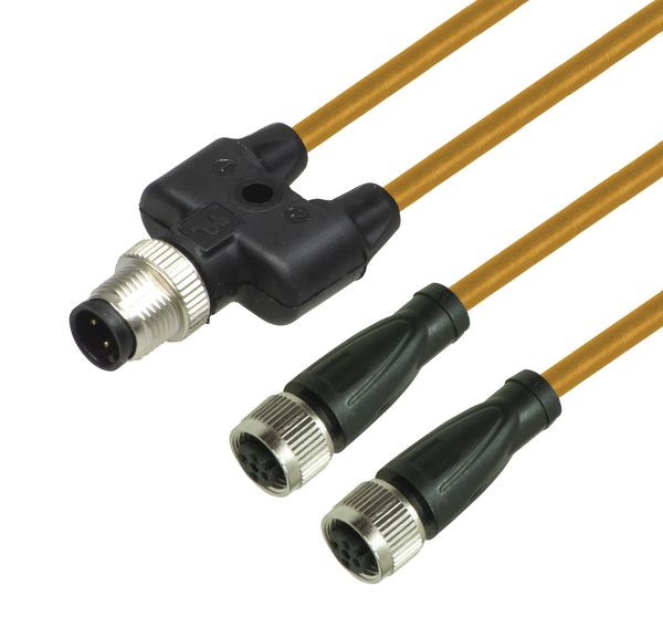 Y-Verbindungskabel M12-Stecker gerade A-kodiert 4-polig auf 2x M12-Buchse gerade A-kodiert 4-polig, 2x POC-Kabel schweißperlenbeständig orange, robotertauglich, torsionsgeeignet, ölbeständig, molekular vernetzt