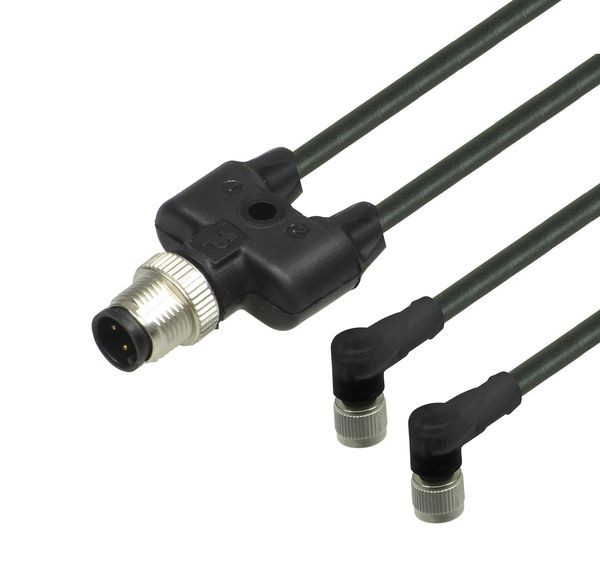 Y-Verbindungskabel M12-Stecker gerade A-kodiert 4-polig auf 2x M8-Buchse gewinkelt A-kodiert 3-polig, 2x PUR-Kabel schwarz, UL-zugelassen, schleppkettentauglich, torsionsgeeignet