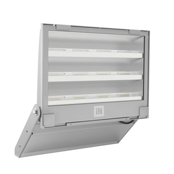 LED-Scheinwerfer für den Außen- und Innenbereich, bestehend aus: Mit Polymerpulverlack körnig grau lackiertes Aluminiumdruckgussgehäuse nach vorheriger chemischer Oberflächenbehandlung. Diffusor aus extraklarem temperiertem Sicherheits-Flachglas. Hochleistungsreflektoren aus metallisiertem Reinstaluminium 99,99%, hochglänzend, oxidations- und irisierungsfrei. Altersbeständige Silikon-Dichtung. Anschlussbox aus schwarzem Technopolymer. Stopfbuchsen für Kabel D= 7-17 mm. Dimmbare EVGs (DALI). LED-Module und Reflektoren, die speziell für Umgebungen entwickelt wurden, in denen Lichtverteilungen mit hoher Asymmetrie realisiert werden müssen. Außenschrauben aus Edelstahl. Aluminium-Clip mit Edelstahlfeder, unverlierbar. Stahlbügel, lackiert mit Polyesterpulverlack nach Feuerverzinkung. Kabelbox, lackiert mit Polyesterpulverlack nach Kataphorese-Beschichtung.