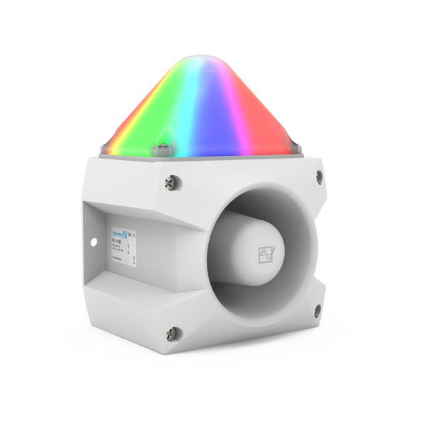 Kompakter RGB-LED-Schallgeber in grau mit weißer Haube, Leuchtfarben gelb, rot, grün und blau frei einstellbar in nur einem Gerät