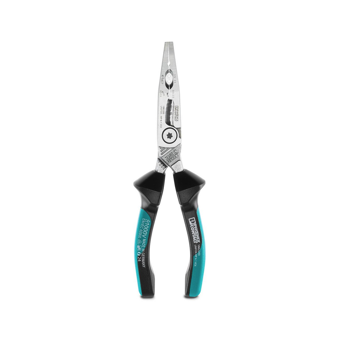 Multifunktionszange, 6 Funktionen in einem Werkzeug, mit Abisolier- und Crimpbereich für Aderendhülsen, mit Kabelschneider, VDE geprüft.