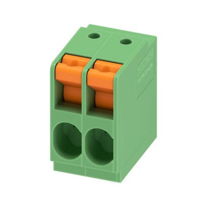 Leiterplattenklemme, Nennstrom: 41 A, Bemessungsspannung (III/2): 1000 V, Nennquerschnitt: 4 mm², Anzahl der Potenziale: 2, Anzahl der Reihen: 1, Polzahl pro Reihe: 2, Artikelfamilie: TDPT 4/..-SP, Rastermaß: 6,35 mm, Anschlussart: Push-in-Federanschluss, Montage: Wellenlöten, Anschlussrichtung Leiter/Platine: 0 °, Farbe: grün, Pin-Layout: Zick-Zack-Pinning W, Pinlänge [P]: 3,5 mm, Anzahl der Lötpins pro Potenzial: 1, Verpackungsart: verpackt im Karton