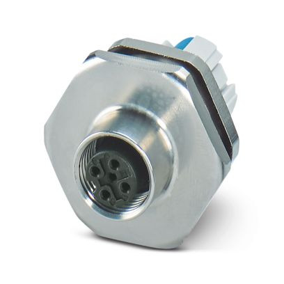 Wanddurchführung, Universal, 4-polig, ungeschirmt, Buchse gerade M12, Kodierung: A, Vorderwandmontage, M20 x 1,5, Push-Lock-Federanschluss, Rändelmaterial: Messing, vernickelt, Flachmutter beiliegend