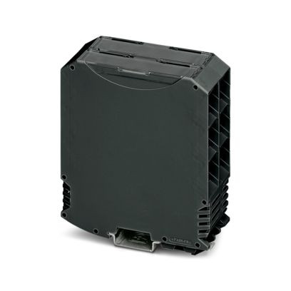 Tragschienengehäuse, Komplettgehäuse mit Metallfußriegel, hohe Bauform, mit Lüftungsschlitzen, Breite: 45,2 mm, Höhe: 99 mm, Tiefe: 113,65 mm, Farbe: schwarz (ähnlich RAL 9005), Querverbindung: Tragschienen-Busverbinder (optional), Polzahl Querverbinder: 5