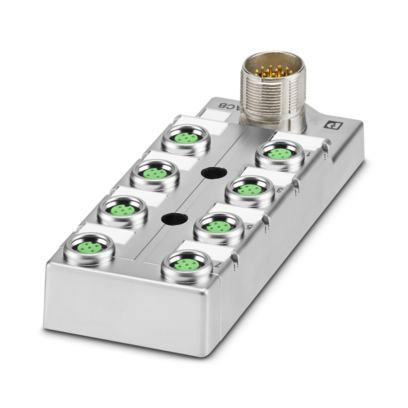 Verteilerbox, Anwendung: Standard, erweiterte Anforderungen, Anschlussart: M12-Buchse Metall / M12-Push-Pull-Buchse, Anzahl der Steckplätze: 8, Polzahl: 5, Kodierung: A, Steckplatzbelegung: doppelt, Statusanzeige: nein, Universal; Stammleitungsanschluss: M23-Steckanschluss 180°, Schirmung: ja