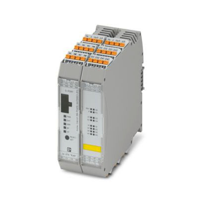 Gateway für die Anbindung von bis zu 15 Interface-Systemteilnehmern über PROFIsafe an eine übergeordnete sichere Steuerung. Die Systemteilnehmer werden durch Tragschienen-Busverbinder mit dem Gateway verbunden, Tragschienen-Busverbinder liegen bei.