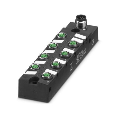 Verteilerbox, Anwendung: Standard, Anschlussart: M8-Buchse Metall, Anzahl der Steckplätze: 8, Polzahl: 3, Kodierung: A, Steckplatzbelegung: einfach, Statusanzeige: ja, PNP; Stammleitungsanschluss: M12-Steckanschluss 90°, Schirmung: nein