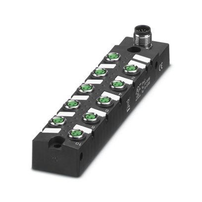 Verteilerbox, Anwendung: Standard, Anschlussart: M8-Buchse Metall, Anzahl der Steckplätze: 10, Polzahl: 3, Kodierung: A, Steckplatzbelegung: einfach, Statusanzeige: ja, PNP; Stammleitungsanschluss: M12-Steckanschluss 90°, Schirmung: nein