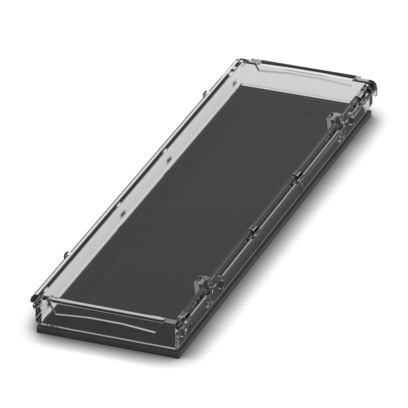 Tragschienengehäuse für den Einsatz in Installationsverteilern nach DIN 43880, transparenter Schwenkdeckel, plombierbar, Breite: 161,6 mm, Höhe: 45 mm, Tiefe: 8 mm, Farbe: schwarz (ähnlich RAL 9005)