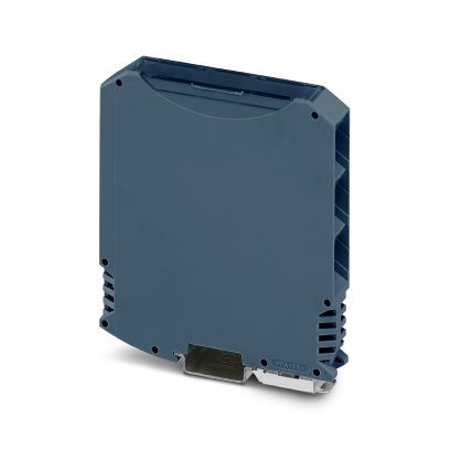 Tragschienengehäuse, Komplettgehäuse mit Metallfußriegel, hohe Bauform, mit Lüftungsschlitzen, Breite: 17,6 mm, Höhe: 99 mm, Tiefe: 113,65 mm, Farbe: blaugrau (ähnlich RAL 7031), Querverbindung: Tragschienen-Busverbinder (optional), Polzahl Querverbinder: 5