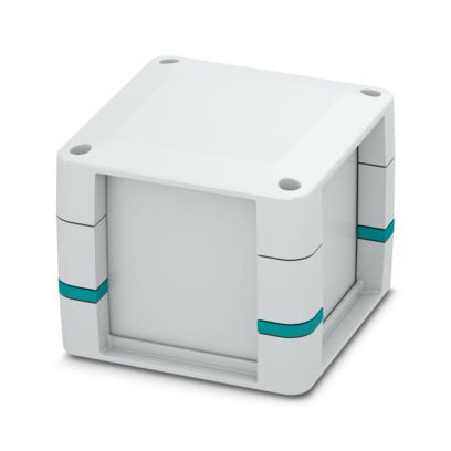 Komplettgehäuse für Leiterplatten, flexibel positionierbar; beinhaltet Gehäusehalbschalen, Seitenwände geschlossen, Klebedome zur Platinenbefestigung, Schrauben für Gehäuse und Platinenbefestigung; Gehäusefarbe lichtgrau mit Eckeinlegern türkisblau