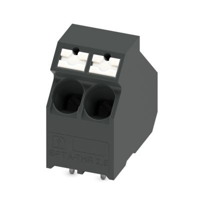 Leiterplattenklemme, Nennstrom: 32 A, Bemessungsspannung (III/2): 400 V, Nennquerschnitt: 4 mm², Anzahl der Reihen: 1, Polzahl pro Reihe: 2, Artikelfamilie: SPTA 2,5/..-THR, Rastermaß: 5 mm, Anschlussart: Push-in-Federanschluss, Montage: THR-Löten / Wellenlöten, Anschlussrichtung Leiter/Platine: 45 °, Farbe: schwarz, Pin-Layout: Lineares Pinning, Pinlänge [P]: 2 mm, Anzahl der Lötpins pro Potenzial: 2, Verpackungsart: Gurt in 44 mm Breite