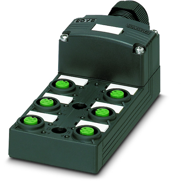 Verteilerbox, Anwendung: Standard, Anschlussart: M12-Buchse Kunststoff, Anzahl der Steckplätze: 6, Polzahl: 5, Kodierung: A, Steckplatzbelegung: doppelt, Statusanzeige: ja, PNP; Stammleitungsanschluss: Steckbarer Schraubanschluss 180°, Schirmung: nein