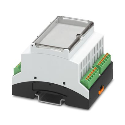 Tragschienengehäuse für den Einsatz in Installationsverteilern nach DIN 43880, zur Montage auf Tragschiene, mit transparenter Schwenkdeckel, Farbe: schwarz (ähnlich RAL 9005), Breite: 71,6 mm, Höhe: 89,7 mm, Tiefe: 60,7 mm, Leiterplattenfläche: 5300 mm²