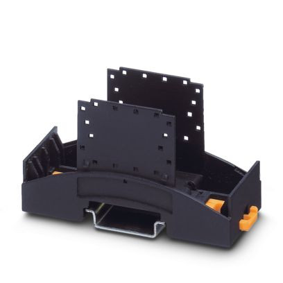 Tragschienengehäuse für den Einsatz in Installationsverteilern nach DIN 43880, Gehäuseunterteil mit Fußriegel, Breite: 35,6 mm, Höhe: 89,7 mm, Tiefe: 48,9 mm, Farbe: schwarz (ähnlich RAL 9005), Querverbindung: Tragschienen-Busverbinder (optional), Polzahl Querverbinder: 16, mit montiertem Fußriegel