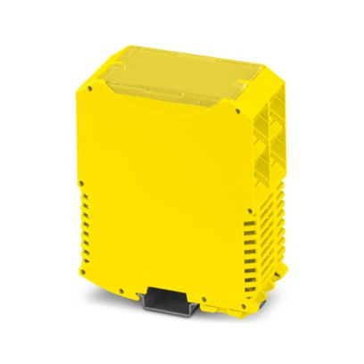 Tragschienengehäuse, Komplettgehäuse mit Metallfußriegel, hohe Bauform, mit Lüftungsschlitzen, Breite: 45,2 mm, Höhe: 99 mm, Tiefe: 113,65 mm, Farbe: gelb (ähnlich RAL 1018), Querverbindung: Tragschienen-Busverbinder (optional), Polzahl Querverbinder: 5