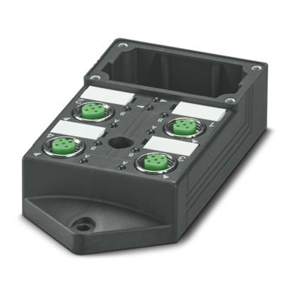 Grundgehäuse-Verteilerbox, Anwendung: Standard, erweiterte Anforderungen, Anschlussart: M12-Buchse Metall, Anzahl der Steckplätze: 4, Polzahl: 5, Kodierung: A, Steckplatzbelegung: doppelt, Statusanzeige: ja, PNP; Stammleitungsanschluss: Steckbarer Schraubanschluss, Schirmung: nein