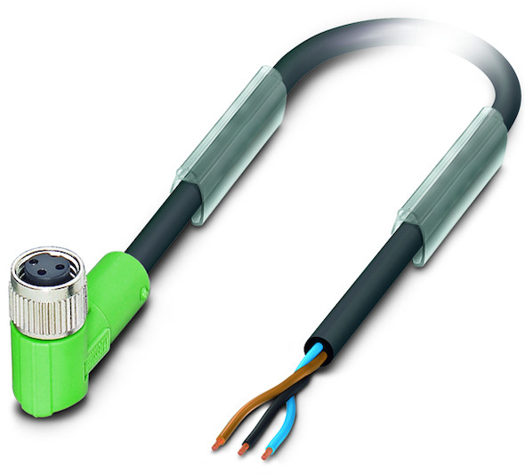 ohne Statusanzeige, die Verbindung zwischen der Verteilerbox und dem Sensor bzw. dem Aktor wird üblicherweise mit einem Sensor-/Aktor-Kabel realisiert, da diese Verkabelung häufig in einer Umgebung umgesetzt wird, bei der mit starker Verschmutzung zu rechnen ist, erfüllen alle Sensor-/Aktor-Kabel-Varianten die Anforderungen der Schutzart IP65/68/69k, um den Schaltzustand des Sensors optisch anzeigen zu können, besitzen die M12-Rundsteckverbinder bis zu 3 Status-LED (24 V, Sensorsignal 1, Sensorsignal 2), Aufgrund der Miniaturisierung der Sensorik an Maschinen werden häufig kleinere Bauformen benötigt, die SAC-Kabel mit M8-Rundsteckverbindern tragen diesem Trend Rechnung, Nennstrom IN: 4 A, Nennspannung UN:60 V, Aderquerschnitt: 0,25 mm2, Kabeldurchmesser: 4,40 mm, Schutzart: P65/IP68/IP69k, Umgebungstemperatur: -40...+80 °C
