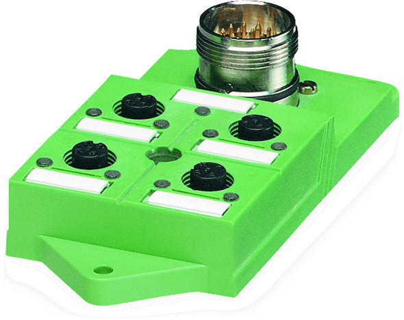 Verteilerbox, Anwendung: Standard, Anschlussart: M12-Buchse Kunststoff, Anzahl der Steckplätze: 4, Polzahl: 5, Kodierung: A, Steckplatzbelegung: doppelt, Statusanzeige: ja, PNP; Stammleitungsanschluss: M23-Steckanschluss 90°, Schirmung: nein