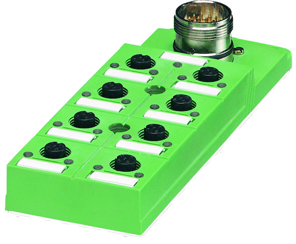 Verteilerbox, Anwendung: Standard, Anschlussart: M12-Buchse Kunststoff, Anzahl der Steckplätze: 6, Polzahl: 4, Kodierung: A, Steckplatzbelegung: einfach, Statusanzeige: ja, PNP; Stammleitungsanschluss: M23-Steckanschluss 90°, Schirmung: nein