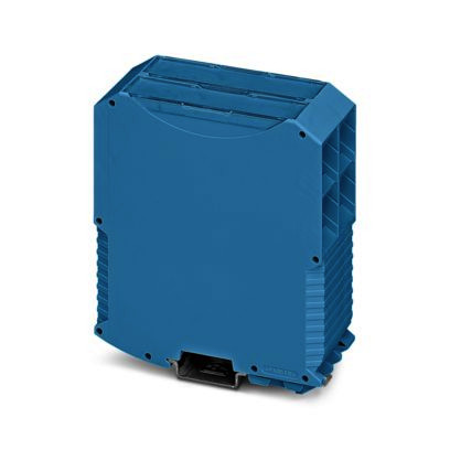Tragschienengehäuse, Komplettgehäuse mit Metallfußriegel, hohe Bauform, ohne Lüftungsschlitze, Breite: 45,2 mm, Höhe: 99 mm, Tiefe: 113,65 mm, Farbe: blau (ähnlich RAL 5015), Querverbindung: Tragschienen-Busverbinder (optional), Polzahl Querverbinder: 5