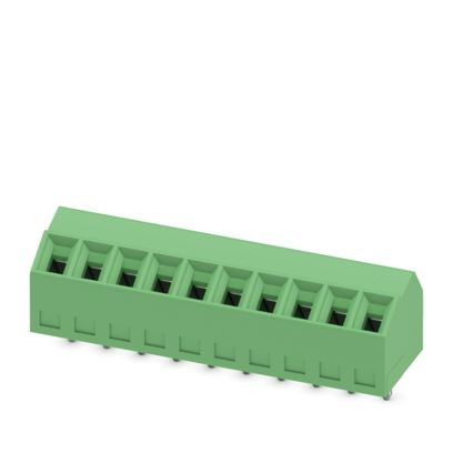 Leiterplattenklemme, Nennstrom: 10 A, Bemessungsspannung (III/2): 200 V, Nennquerschnitt: 1 mm², Anzahl der Potenziale: 10, Anzahl der Reihen: 1, Polzahl pro Reihe: 10, Artikelfamilie: SMKDS 1, Rastermaß: 3,5 mm, Anschlussart: Schraubanschluss mit Zughülse, Schraubenangriffsform: L Längsschlitz, Montage: Wellenlöten, Anschlussrichtung Leiter/Platine: 35 °, Farbe: grün, Pin-Layout: Lineares Pinning, Pinlänge [P]: 3,5 mm, Anzahl der Lötpins pro Potenzial: 1, Verpackungsart: verpackt im Karton