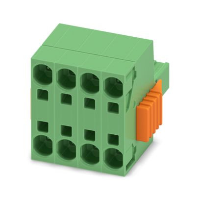 Leiterplatten-TWIN-Stecker, Nennquerschnitt: 6 mm², Farbe: grün, Nennstrom: 32 A, Bemessungsspannung (III/2): 1000 V, Kontaktoberfläche: Sn, Kontaktart: Buchse, Anzahl der Potenziale: 4, Anzahl der Reihen: 1, Polzahl: 4, Anzahl der Anschlüsse: 8, Artikelfamilie: TSPC 5/..-STCL, Rastermaß: 7,62 mm, Anschlussart: Push-in-Federanschluss, Anschlussrichtung Leiter/Platine: 0 °, Rasthaken: - ohne Rasthaken, Stecksystem: COMBICON PC 5, Verriegelung: Clipverriegelung, Befestigungsart: Click & Lock Rastschieber, Verpackungsart: verpackt im Karton