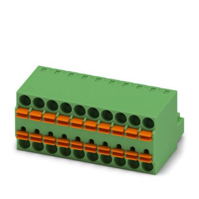 Leiterplatten-TWIN-Stecker, Nennquerschnitt: 1,5 mm², Farbe: grün, Nennstrom: 8 A, Bemessungsspannung (III/2): 160 V, Kontaktoberfläche: Sn, Kontaktart: Buchse, Anzahl der Potenziale: 10, Anzahl der Reihen: 1, Polzahl: 10, Anzahl der Anschlüsse: 20, Artikelfamilie: TFMC 1,5/..-ST, Rastermaß: 3,5 mm, Anschlussart: Push-in-Federanschluss, Anschlussrichtung Leiter/Platine: 0 °, Stecksystem: COMBICON MC 1,5, Ausrichtung Steckgesicht: Standard, Verriegelung: ohne, Befestigungsart: ohne, Verpackungsart: verpackt im Karton