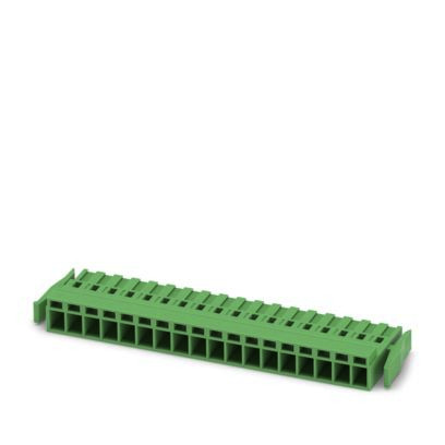 Leiterplattenstecker, Nennquerschnitt: 2,5 mm², Farbe: grün, Nennstrom: 12 A, Bemessungsspannung (III/2): 320 V, Kontaktart: Buchse, Anzahl der Potenziale: 18, Anzahl der Reihen: 1, Polzahl: 18, Anzahl der Anschlüsse: 18, Artikelfamilie: MSTBC 2,5/..-STZ-RF, Rastermaß: 5,08 mm, Anschlussart: Crimpanschluss, Anschlussrichtung Leiter/Platine: 0 °, Rasthaken: - ohne Rasthaken, Stecksystem: COMBICON MSTB 2,5, Verriegelung: Rastverriegelung, Befestigungsart: Rastflansch, Verpackungsart: verpackt im Karton, Zugehörige Crimp-Buchsenkontakte mit Angaben zu Strom [A] und Leiterquerschnittsbereich [mm²] : 10A/MSTBC-MT 0,5-1,0 (3190564); 10A/MSTBC-MT 0,5-1,0 BA (3190645); 12A/MSTBC-MT 1,5-2,5 (3190551); 12A/MSTBC-MT 1,5-2,5 BA (3190658). BA = Bandkontakte
