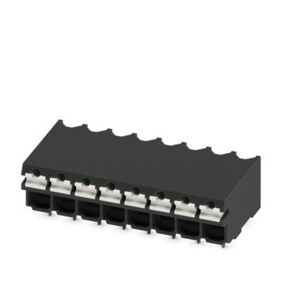 Leiterplattenklemme, Nennstrom: 17,5 A, Bemessungsspannung (III/2): 160 V, Nennquerschnitt: 1,5 mm², Anzahl der Potenziale: 8, Anzahl der Reihen: 1, Polzahl pro Reihe: 8, Artikelfamilie: SPT 1,5/..-H-THR, Rastermaß: 3,5 mm, Anschlussart: Push-in-Federanschluss, Montage: THR-Löten / Wellenlöten, Anschlussrichtung Leiter/Platine: 0 °, Farbe: schwarz, Pin-Layout: Lineares Pinning, Pinlänge [P]: 2 mm, Anzahl der Lötpins pro Potenzial: 2, Verpackungsart: Gurt in 44 mm Breite