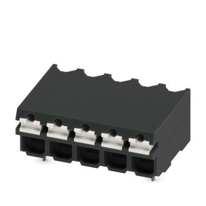 Leiterplattenklemme, Nennstrom: 17,5 A, Bemessungsspannung (III/2): 160 V, Nennquerschnitt: 1,5 mm², Anzahl der Potenziale: 5, Anzahl der Reihen: 1, Polzahl pro Reihe: 5, Artikelfamilie: SPT 1,5/..-H-SMD, Rastermaß: 3,81 mm, Anschlussart: Push-in-Federanschluss, Montage: SMD-Löten, Anschlussrichtung Leiter/Platine: 0 °, Farbe: schwarz, Pin-Layout: Lineare Pad-Geometrie, Anzahl der Lötpins pro Potenzial: 1, Verpackungsart: Gurt in 44 mm Breite