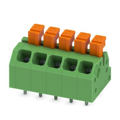 Leiterplattenklemme, Nennstrom: 13,5 A, Bemessungsspannung (III/2): 160 V, Nennquerschnitt: 1 mm², Anzahl der Potenziale: 5, Anzahl der Reihen: 1, Polzahl pro Reihe: 5, Artikelfamilie: SPTAF 1/..-LL, Rastermaß: 3,5 mm, Anschlussart: Push-in-Federanschluss, Montage: Wellenlöten, Anschlussrichtung Leiter/Platine: 45 °, Farbe: grün, Pin-Layout: Lineares Pinning, Pinlänge [P]: 2,6 mm, Anzahl der Lötpins pro Potenzial: 2, Verpackungsart: verpackt im Karton