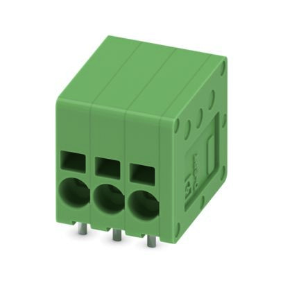 Leiterplattenklemme, Nennstrom: 17,5 A, Bemessungsspannung (III/2): 200 V, Nennquerschnitt: 1,5 mm², Anzahl der Potenziale: 3, Anzahl der Reihen: 1, Polzahl pro Reihe: 3, Artikelfamilie: SPT 1,5/..-H, Rastermaß: 3,5 mm, Anschlussart: Push-in-Federanschluss, Montage: Wellenlöten, Anschlussrichtung Leiter/Platine: 0 °, Farbe: grün, Pin-Layout: Lineares Pinning, Pinlänge [P]: 2,5 mm, Anzahl der Lötpins pro Potenzial: 2, Verpackungsart: verpackt im Karton