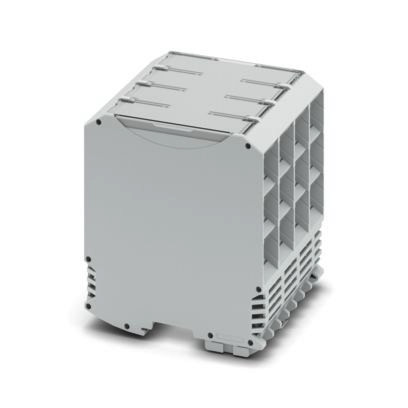 Tragschienengehäuse, Komplettgehäuse mit Metallfußriegel, hohe Bauform, mit Lüftungsschlitzen, Breite: 90,4 mm, Höhe: 99 mm, Tiefe: 113,65 mm, Farbe: lichtgrau (ähnlich RAL 7035), Querverbindung: Tragschienen-Busverbinder (optional), Polzahl Querverbinder: 5