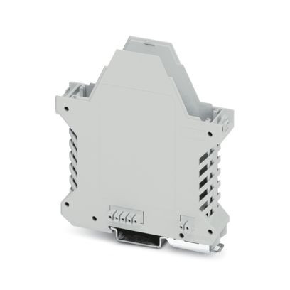 Tragschienengehäuse, Gehäuseunterteil mit Metallfußriegel, mit FE-Kontakt, hohe Bauform, mit Lüftungsschlitzen, Breite: 22,6 mm, Höhe: 99 mm, Tiefe: 107,3 mm, Farbe: lichtgrau (ähnlich RAL 7035), Querverbindung: integrierter Busverbinder, Polzahl Querverbinder: 5+2, Busverbinder: 5 parallele Kontakte, 2 serielle Kontakte