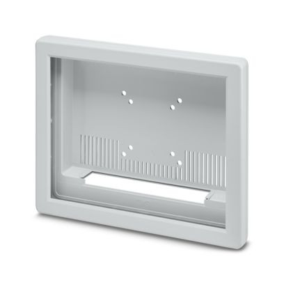 Display-Gehäuse 15" lichtgrau, Fenster mittig, Front eben, mit Lüftungsschlitzen, Ausschnitt für Anschlusstechnik-Winkelblech und VESA-Aufnahme bestehend aus zwei Halbschalen mit Schrauben