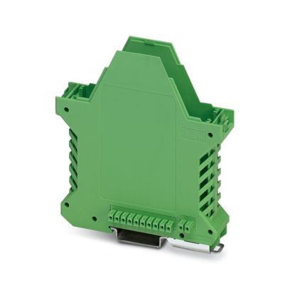 Tragschienengehäuse, Gehäuseunterteil mit Metallfußriegel, mit FE-Kontakt, hohe Bauform, mit Lüftungsschlitzen, Breite: 22,6 mm, Höhe: 99 mm, Tiefe: 107,3 mm, Farbe: grün (ähnlich RAL 6021), Querverbindung: integrierter Busverbinder, Polzahl Querverbinder: 10+2, Busverbinder: 10 parallele Kontakte, 2 serielle Kontakte