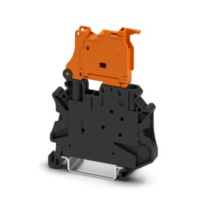 Hebeltrennklemme, mit Prüfbuchsenschrauben zur Aufnahme von Prüfsteckern, Nennspannung: 500 V, Nennstrom: 20 A, Anschlussart: Schraubanschluss, Bemessungsquerschnitt: 4 mm², Querschnitt: 0,14 mm² - 6 mm², Montage: NS 35/7,5, NS 35/15, Farbe: schwarz/orange