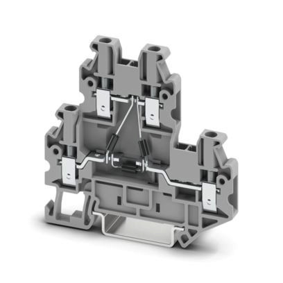 Bauelementreihenklemme, Der max. Strom wird durch die Diode bestimmt. Eingebaut: Diode 1N 4007, Sperrspannung: 1300 V, Dauergrenzstrom: 0,5 A., mit integrierter Diode, Nennstrom: 0,5 A, Anschlussart: Schraubanschluss, 1. und 2. Etage, Bemessungsquerschnitt: 2,5 mm², Querschnitt: 0,14 mm² - 4 mm², Montageart: NS 35/7,5, NS 35/15, Farbe: grau