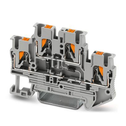Bauelementreihenklemme, mit integrierter Diode 1N4007, Nennstrom: 0,5 A, Anzahl der Anschlüsse: 4, Anschlussart: Push-in-Anschluss, Bemessungsquerschnitt: 2,5 mm², 1. und 2. Etage, Querschnitt: 0,14 mm² - 4 mm², Montageart: NS 35/7,5, NS 35/15, Farbe: grau